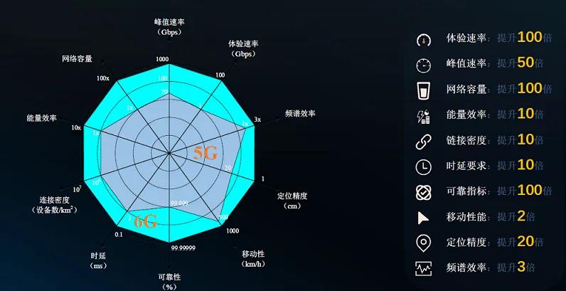 5G作为4G的延伸,,,,也具有明显的高速率,,低时延、、、、大容量等特征,,,,例如:传输速度可达20Gbps;时延低至1ms;5G室内定位精度3.5GHz频段下在5m左右,,毫米波定位精度可以达到3m……但6G与之相较,,,优势更为突出。。